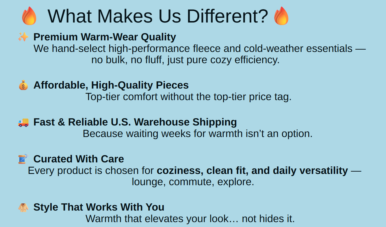 Durable, winter-ready materials built around our motto: Stay Warm. Stay Cozy. Stay Bold.